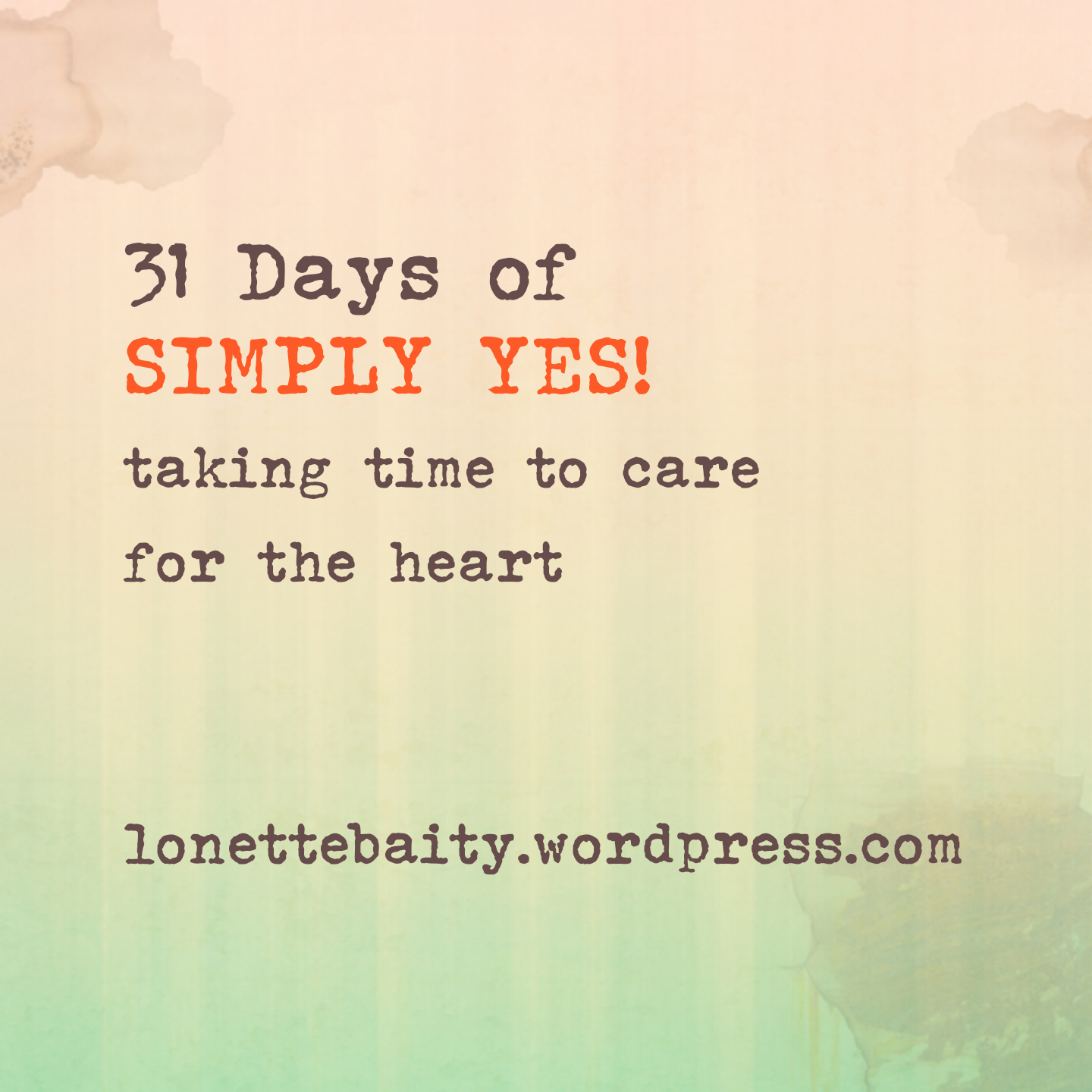 Over the next 31 days, I’ll share my journey of choosing to say “YES” (varying topics) each day. Some will be fun and funny. Others will a bit more thought provoking. The goal in the end it to find a way each day to say, “Yes” to the heart–God’s, a loved-one’s, or mine.